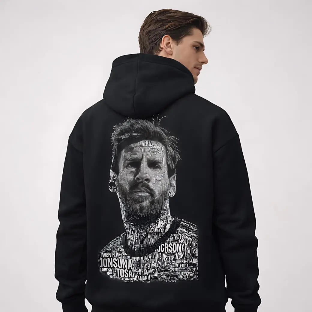 This hoodie features a bold typography-style Messi portrait on the back, crafted from 400 GSM heavy cotton. Oversized, warm, and finished with a front chest Messi signature for that clean flex.